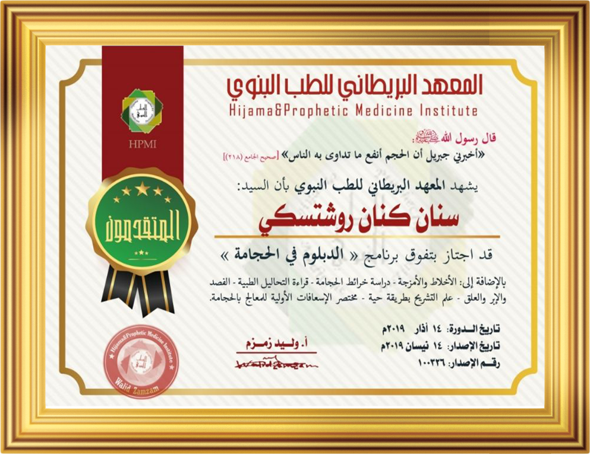 Ixhazet: diplomë te Ezanit e marrur nga mësuesi im Ahmed Surur ebu Fadl, i cili e ka marrë nga mësuesi i tij Hasen bin Alij El-lubnani, e kështu në varg deri te Muezini i pare Bilal bin Rebah el Habeshi ( Allahu qofte i krnaqur me te )